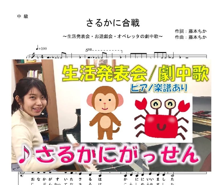 日本昔話「さるかに合戦」の劇中歌 ピアノ楽譜(全4ページ、4曲セット)