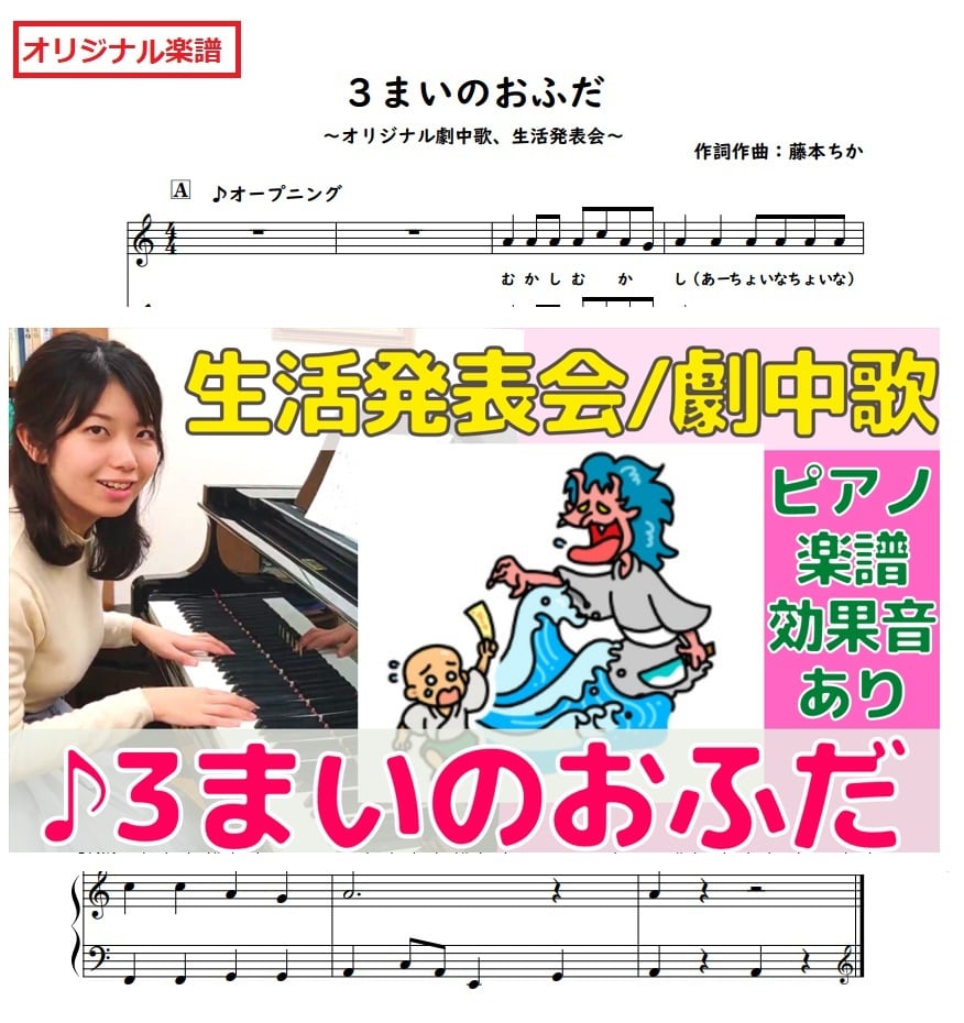 「3まいのおふだ」の劇中歌 ピアノ楽譜(全6ページ19曲:歌7曲・効果音12音)