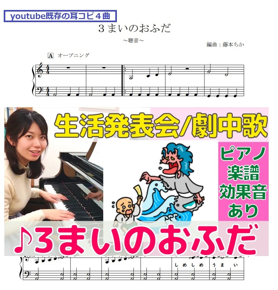 「3まいのおふだ」の劇中歌 ピアノ楽譜(全4ページ4曲:歌3曲・効果音1音)